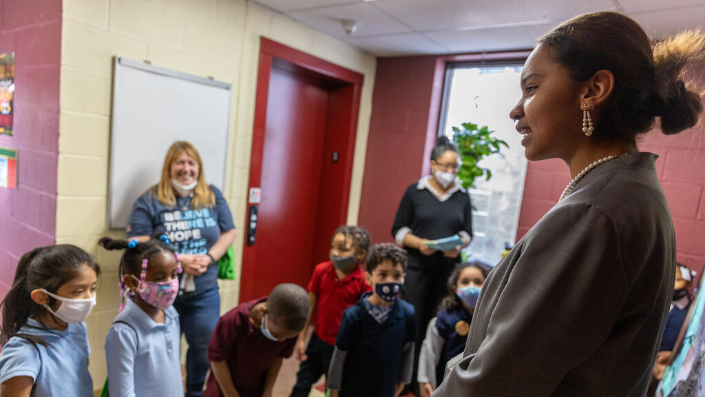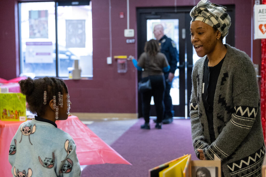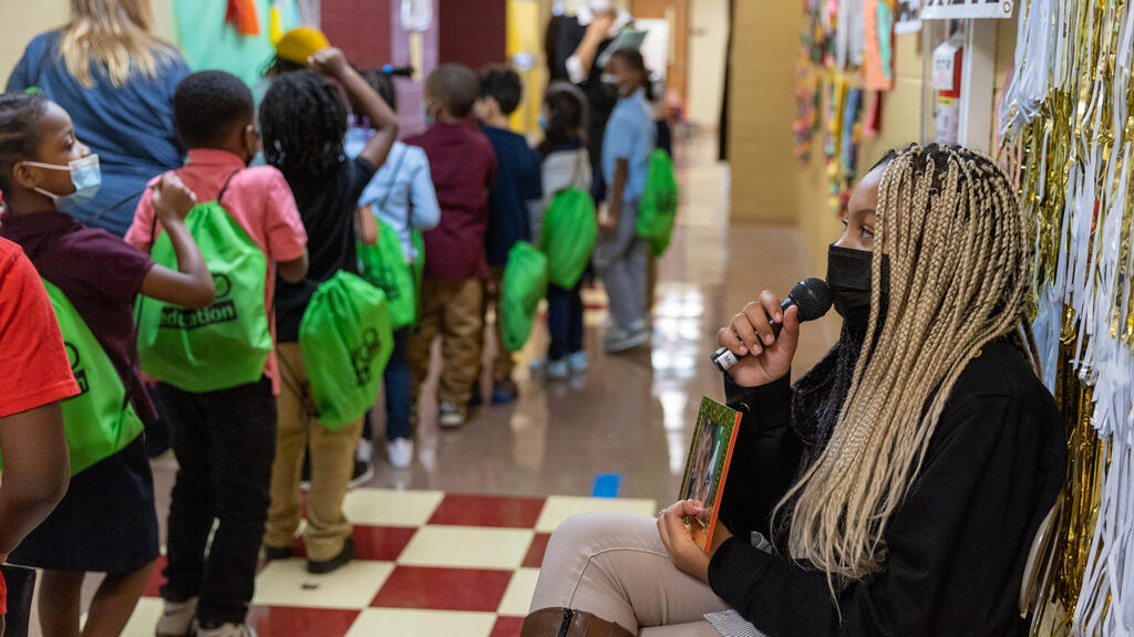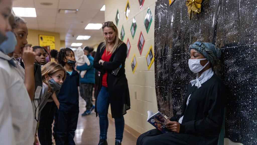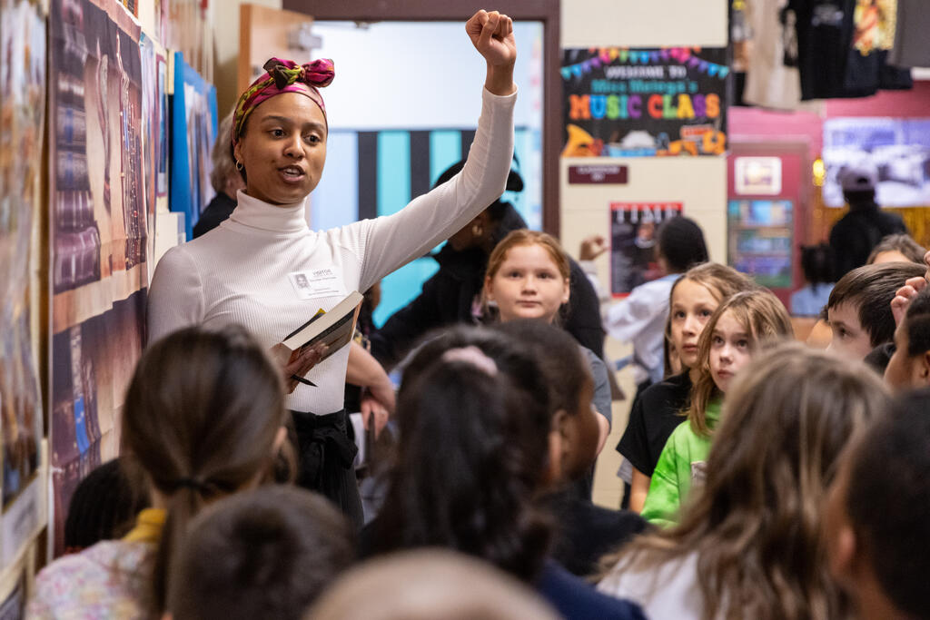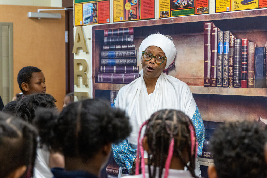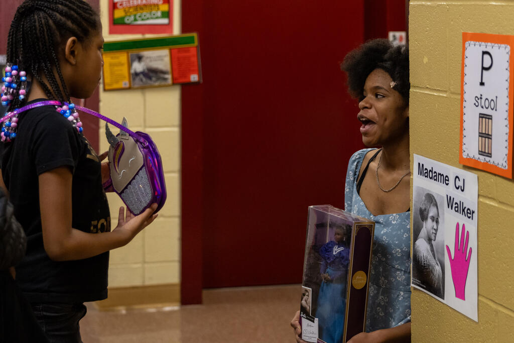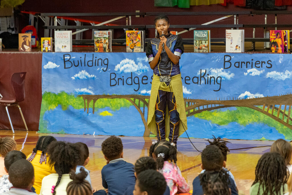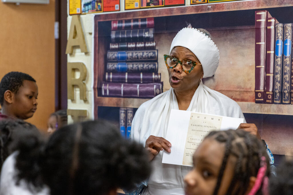 Inside the halls of Barrett Elementary, a young elementary student pressed her hand to a sign on a wall. As she did, a figure came to life. Phillis Wheatley, portrayed by Desiree Harrison, began to share her life story. Sold into slavery out of West Africa, Wheatley became the first African American to publish a book of poetry. As students and community members gathered around her, Harrison relayed information about Wheatley's life and work.
