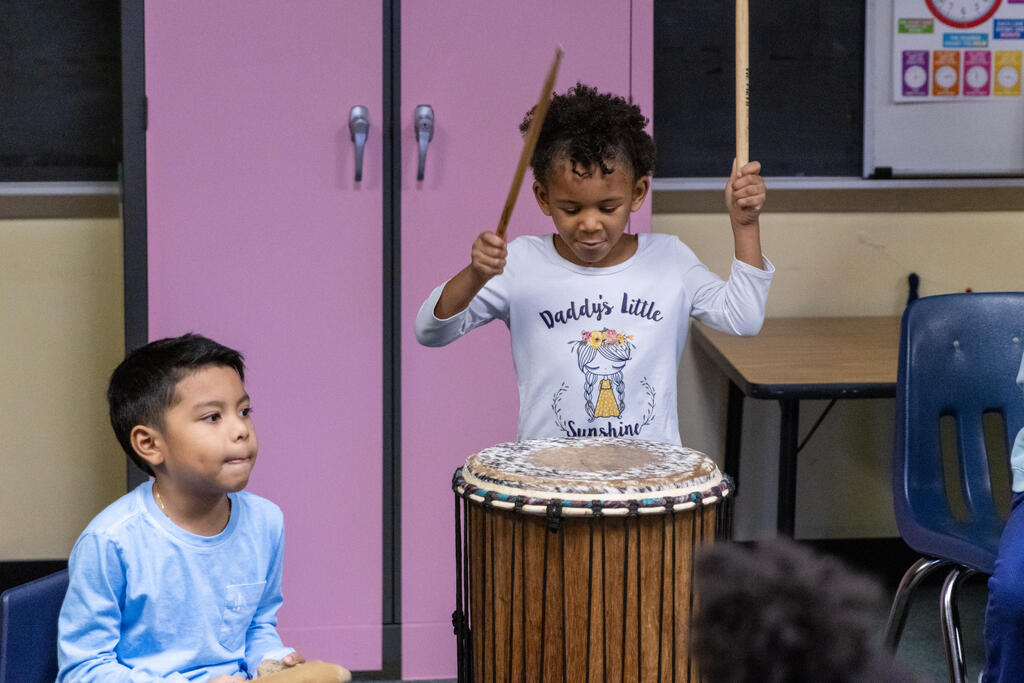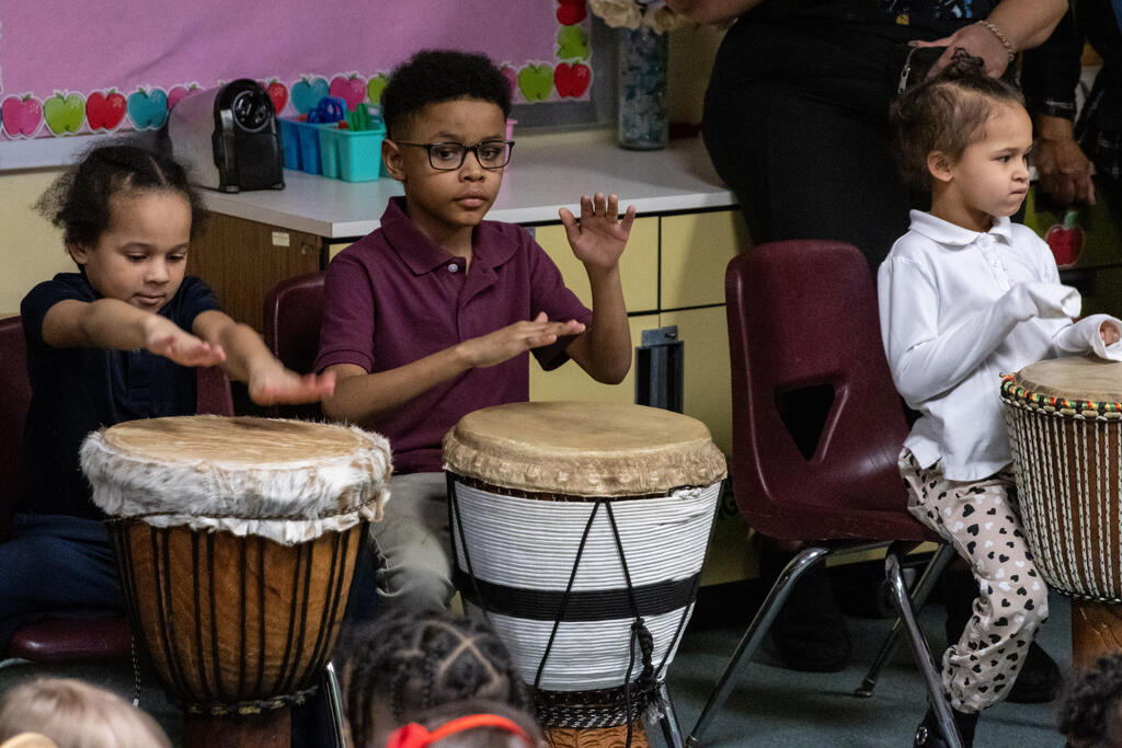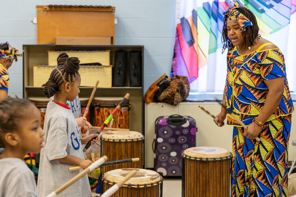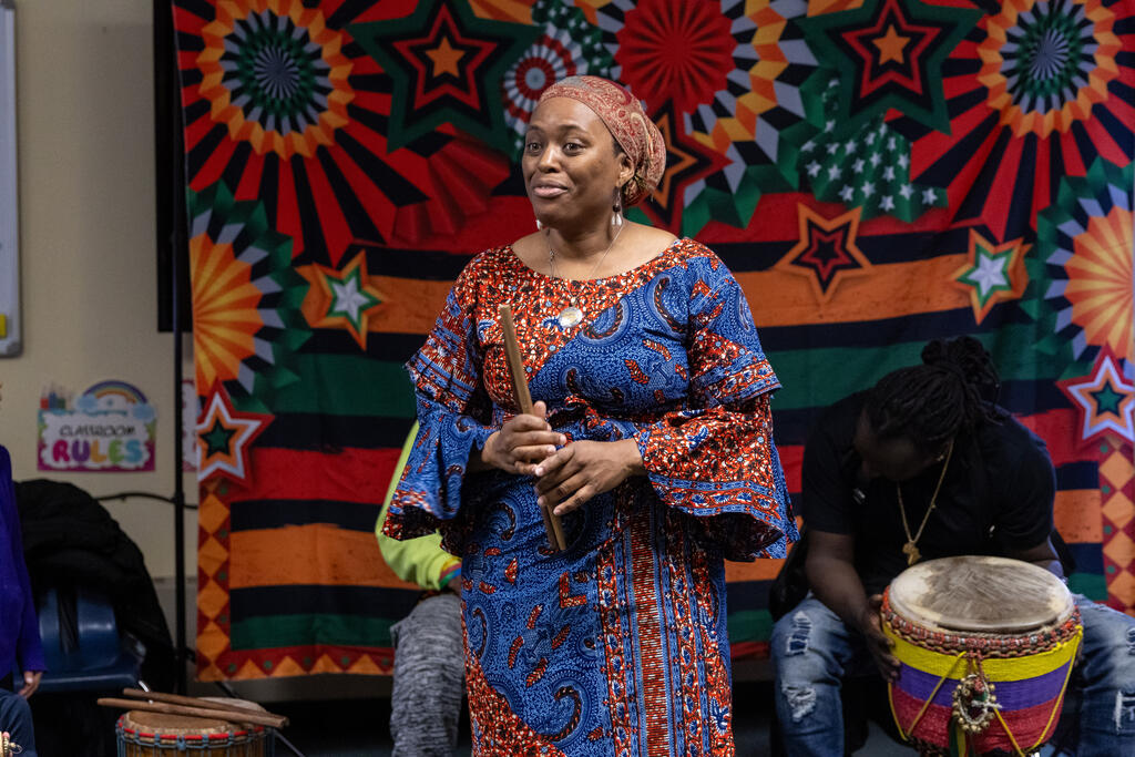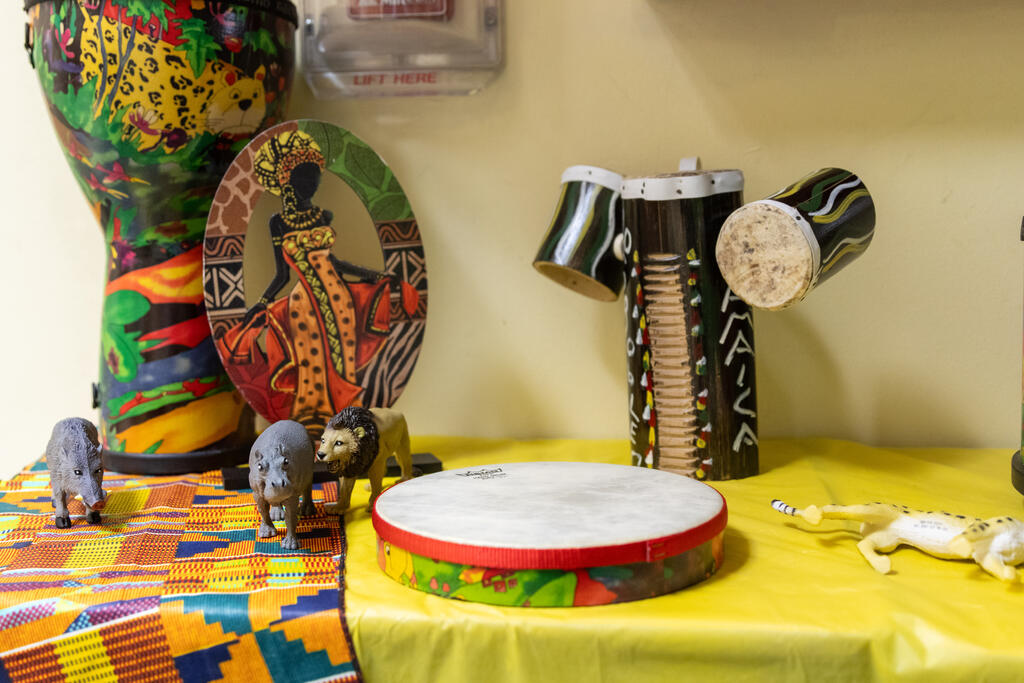 Down the hall, another group of students listed to traditional stories in specific dialects. Two floors above, they drummed away on African instruments.