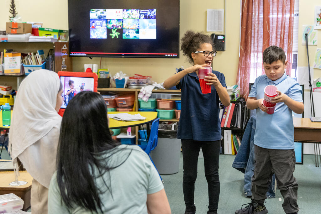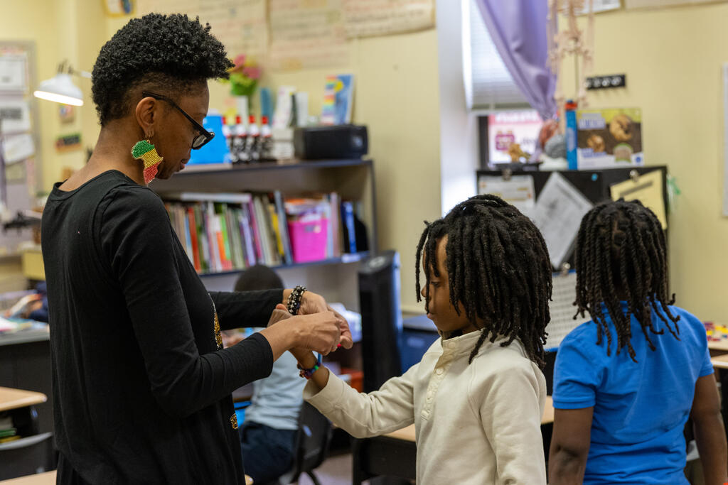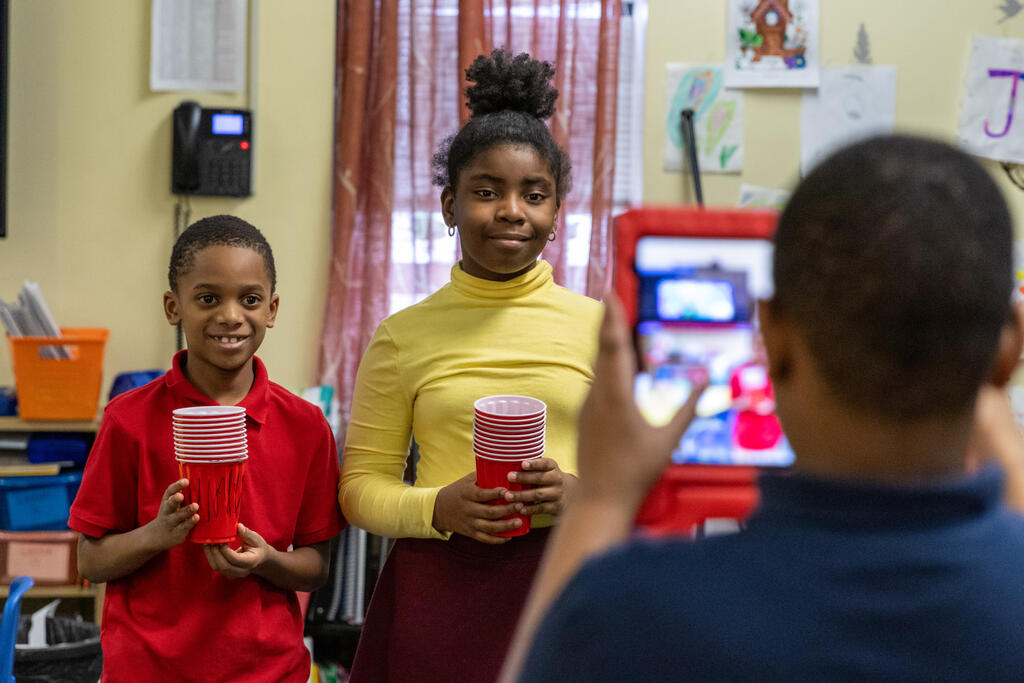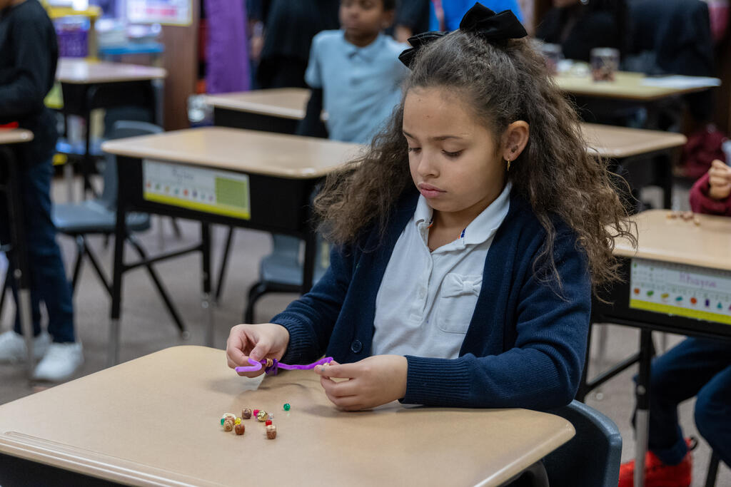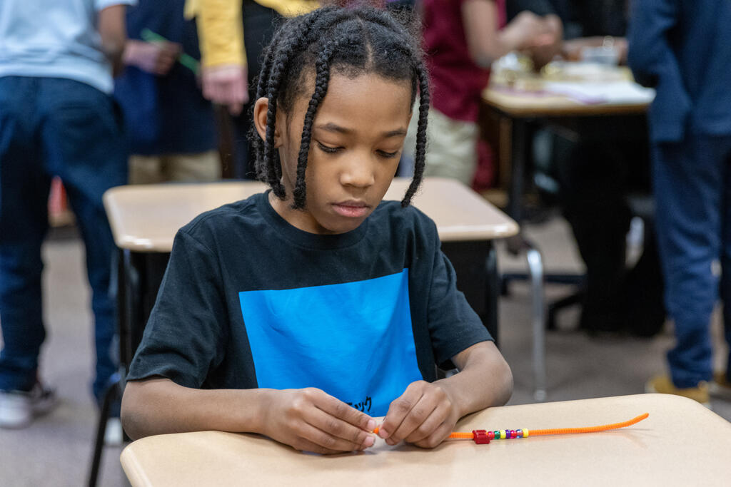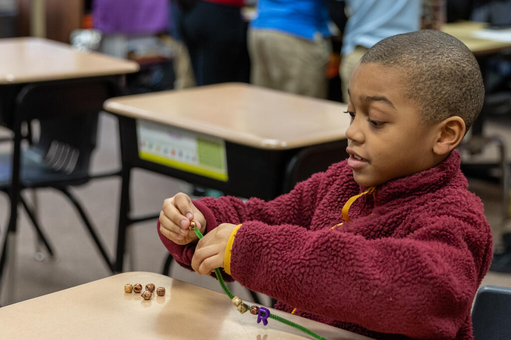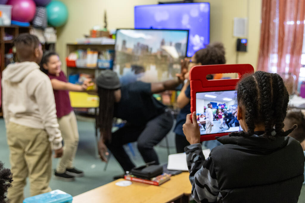 In one classroom, students experimented with photography and movement, as they used a tablet to take photos of their classmates moving around and expressing themselves. In another classroom, two artists helped students identify patterns. They performed a chant that included multiple patterns, with one half of the class eventually chanting one part while the other half simultaneously chanted a second part. They also created bracelets that incorporated colorful patterns.