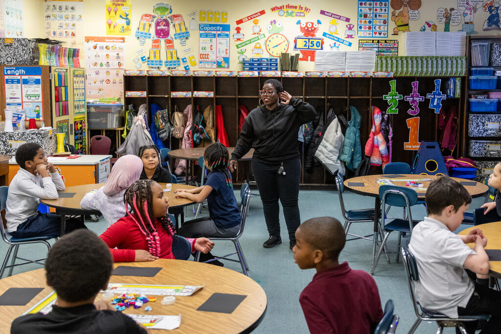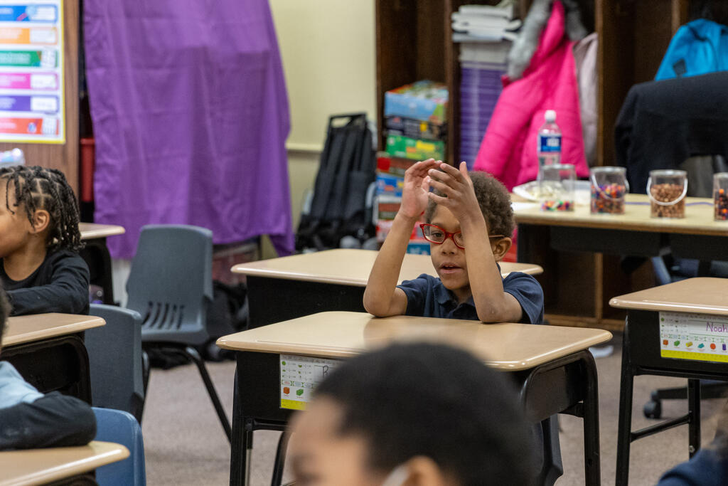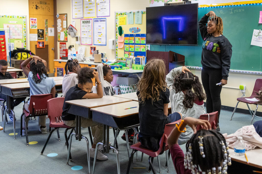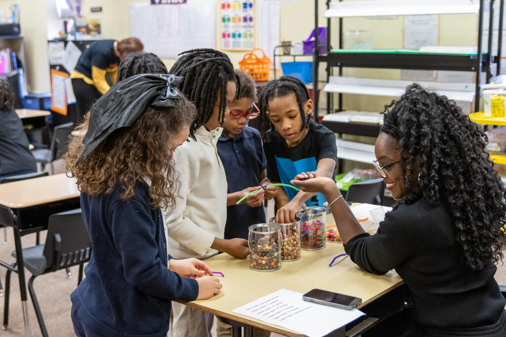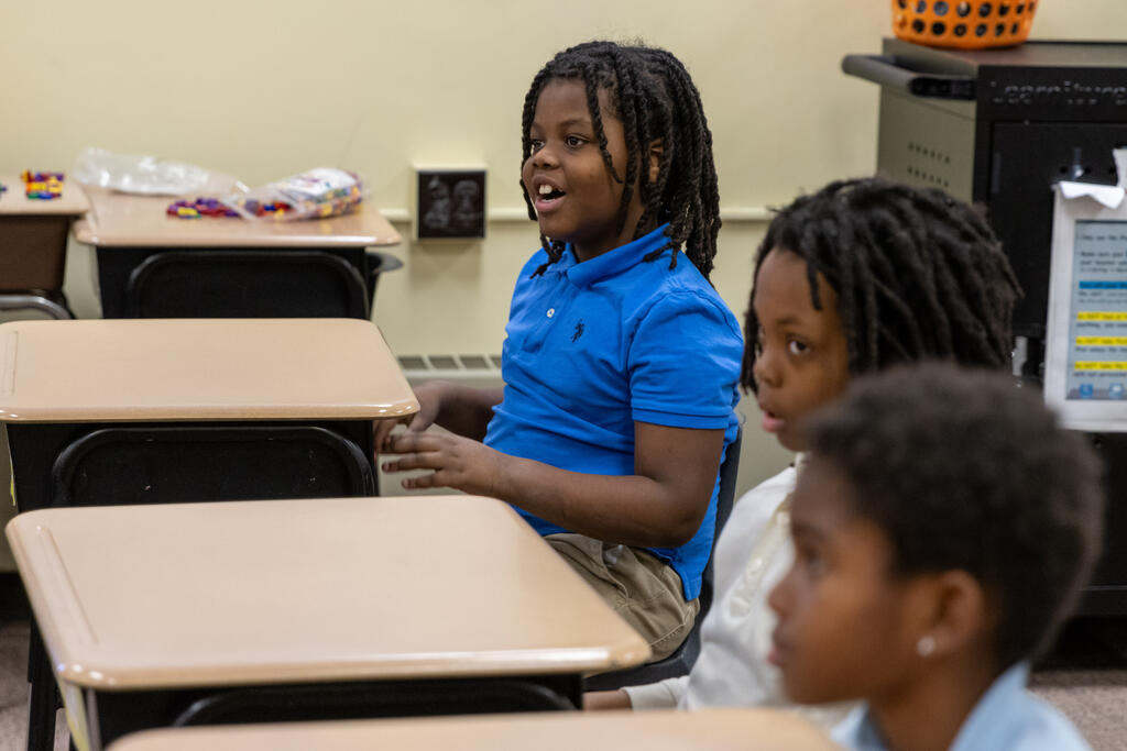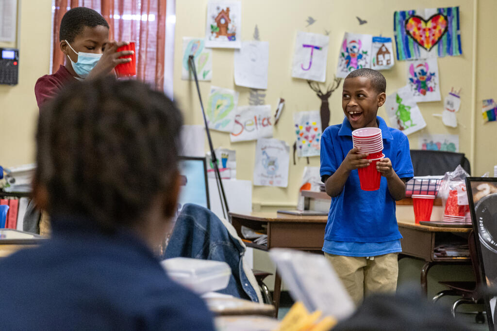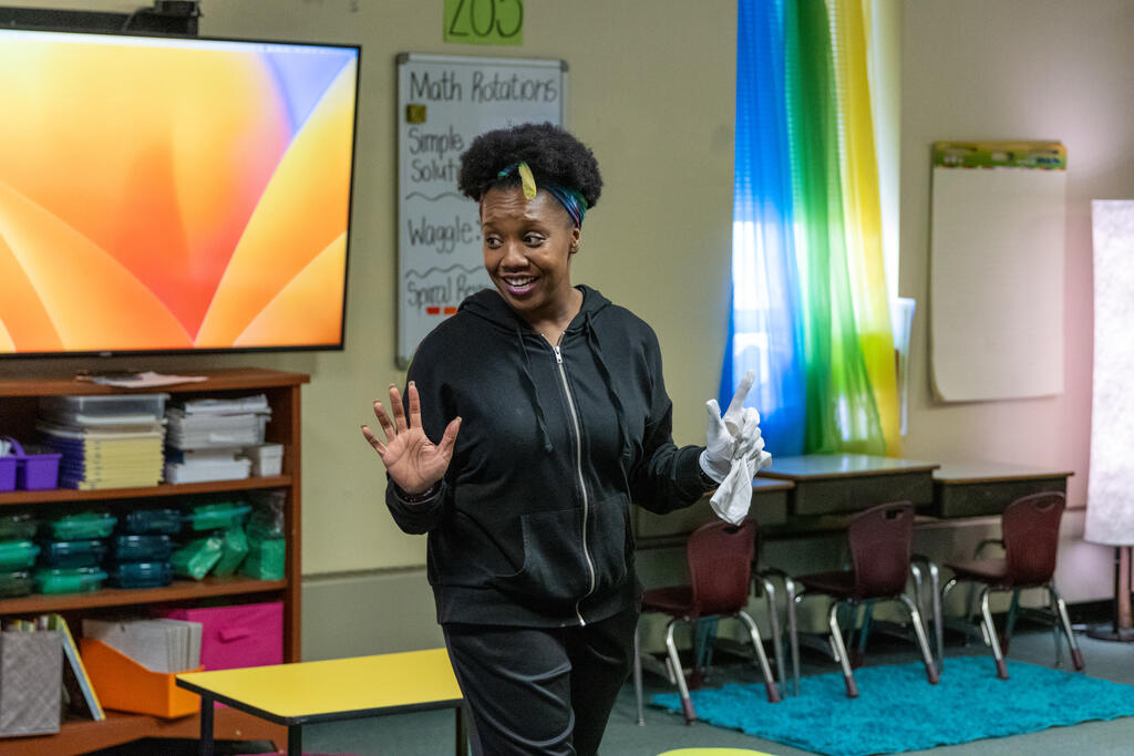 In one classroom, students experimented with photography and movement, as they used a tablet to take photos of their classmates moving around and expressing themselves. In another classroom, two artists helped students identify patterns. They performed a chant that included multiple patterns, with one half of the class eventually chanting one part while the other half simultaneously chanted a second part. They also created bracelets that incorporated colorful patterns.