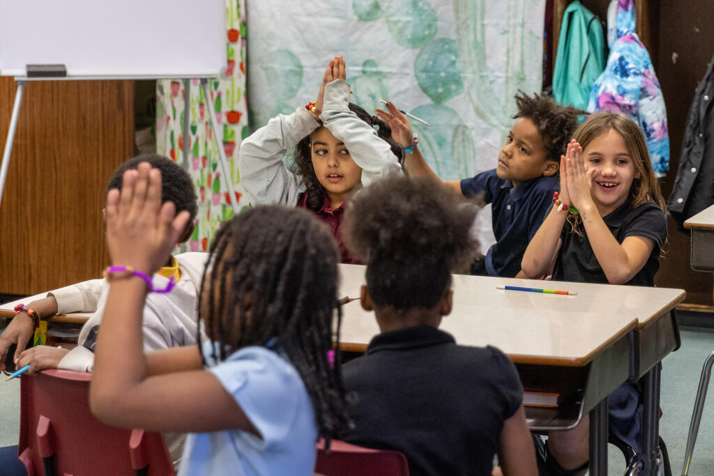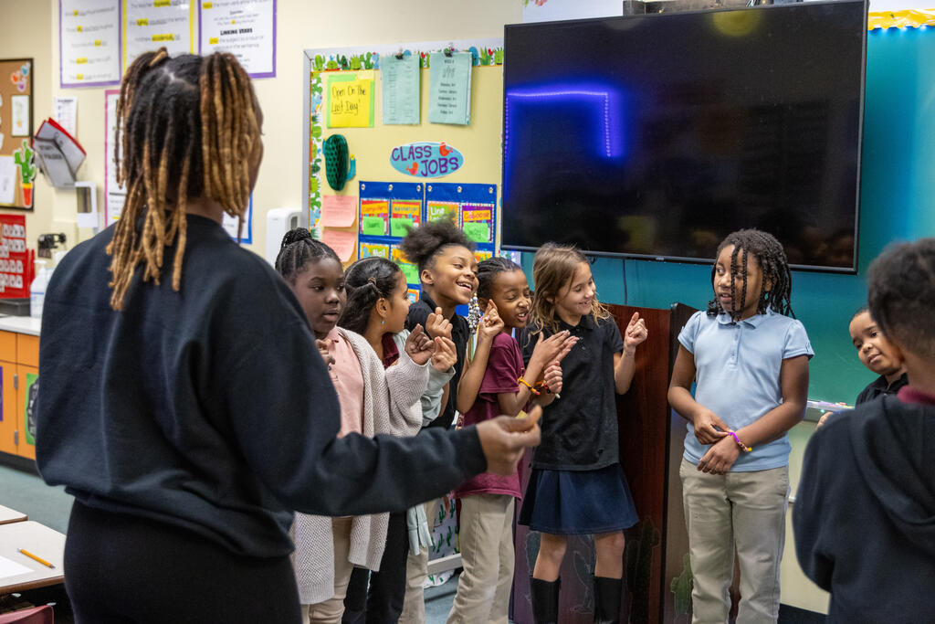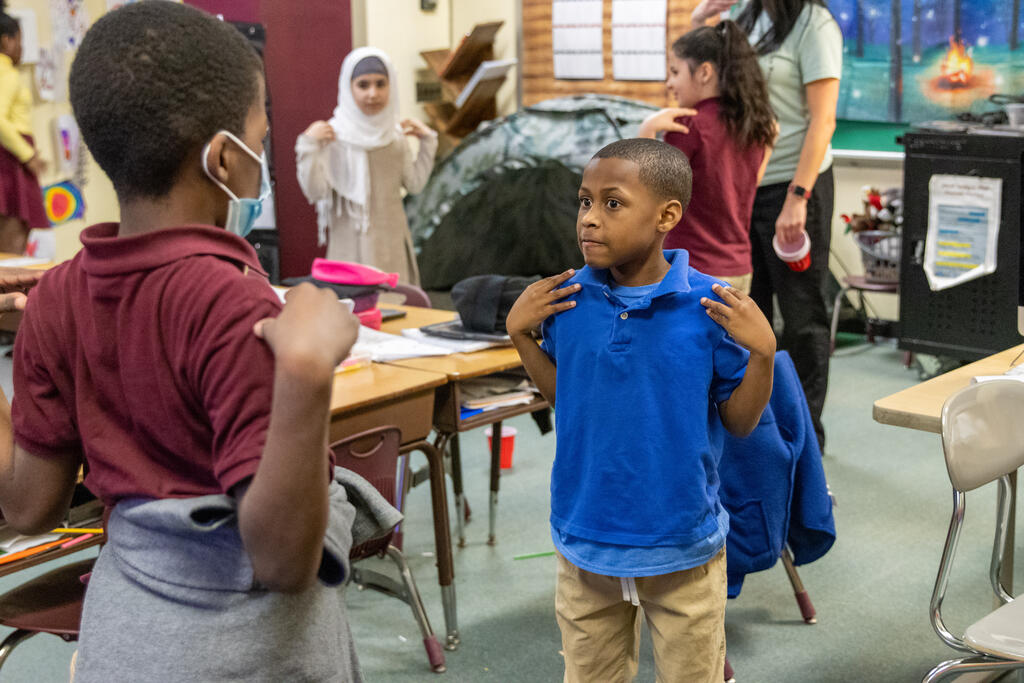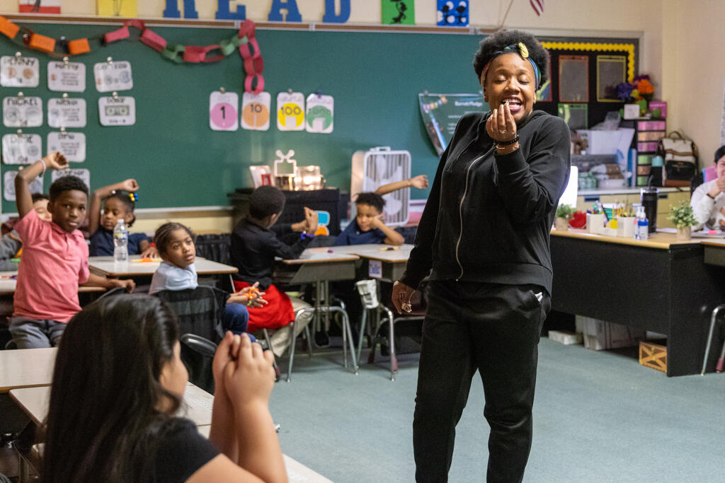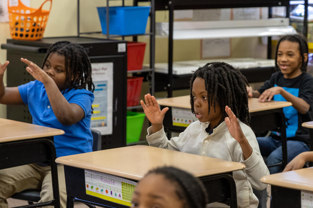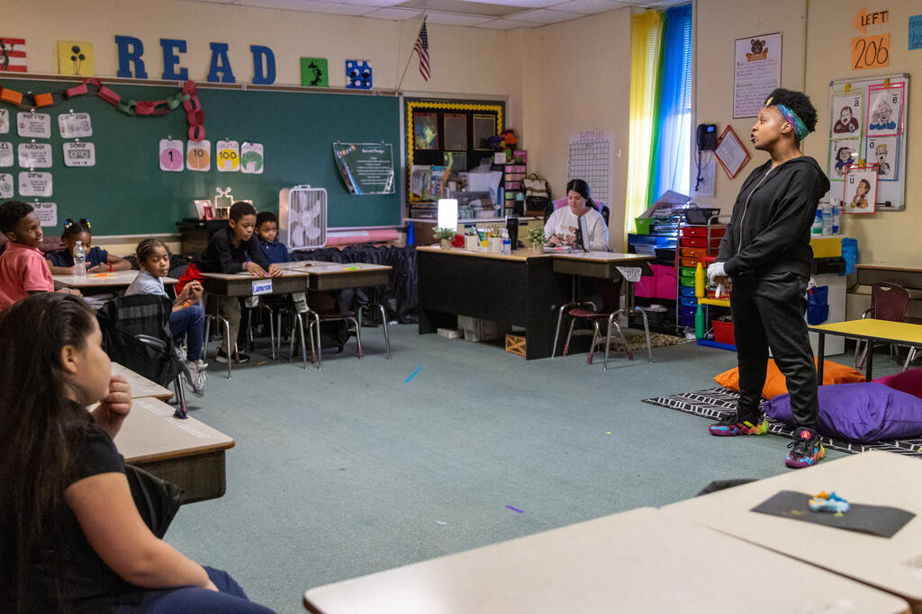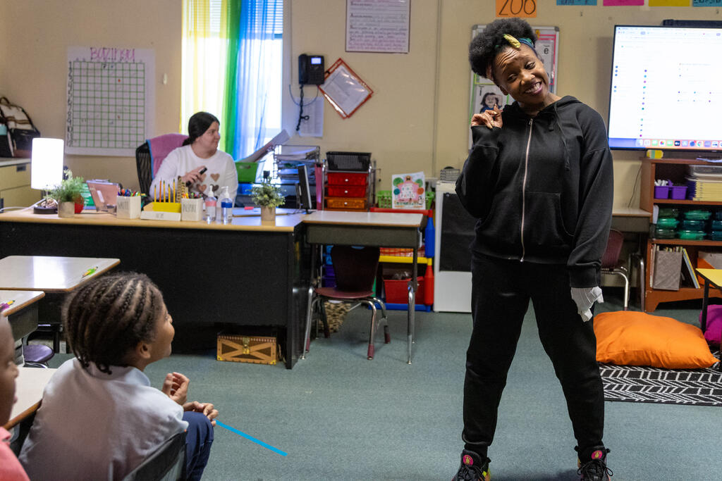 Students also expressed themselves through poetry by choosing words that described them and their class. Once they had constructed their poem, they recited it to a beat. The second and third graders also learned the basics of sign language thanks to an artist who taught them about being a mime. She shared how to communicate without speaking, but also reminded them of how important it is to listen.