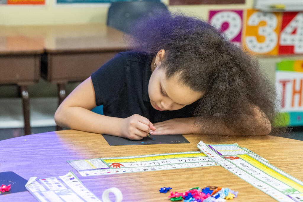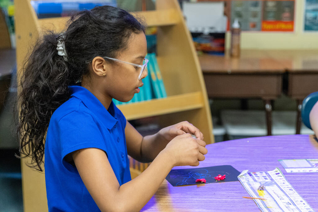 Inside a third room, students worked on colorful art, with the choice to make it Valentine's Day, Love Day, or even anti-Love Day themed, if they were feeling particularly grumpy. The students used toothpicks to draw on a special piece of black paper. As they scraped the toothpick across the paper, the black covering was erased to unveil a rich display of colors.