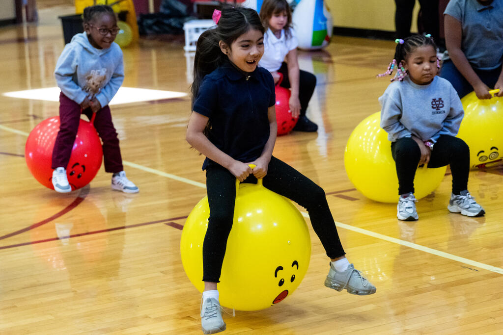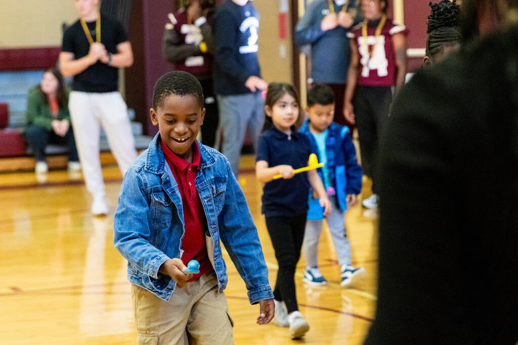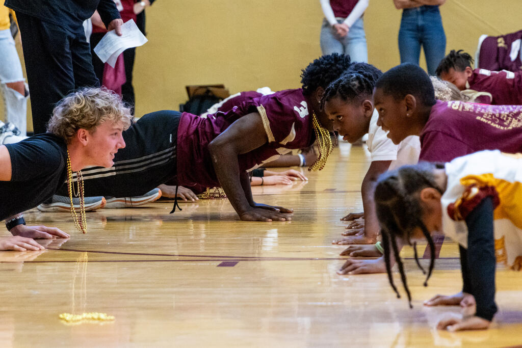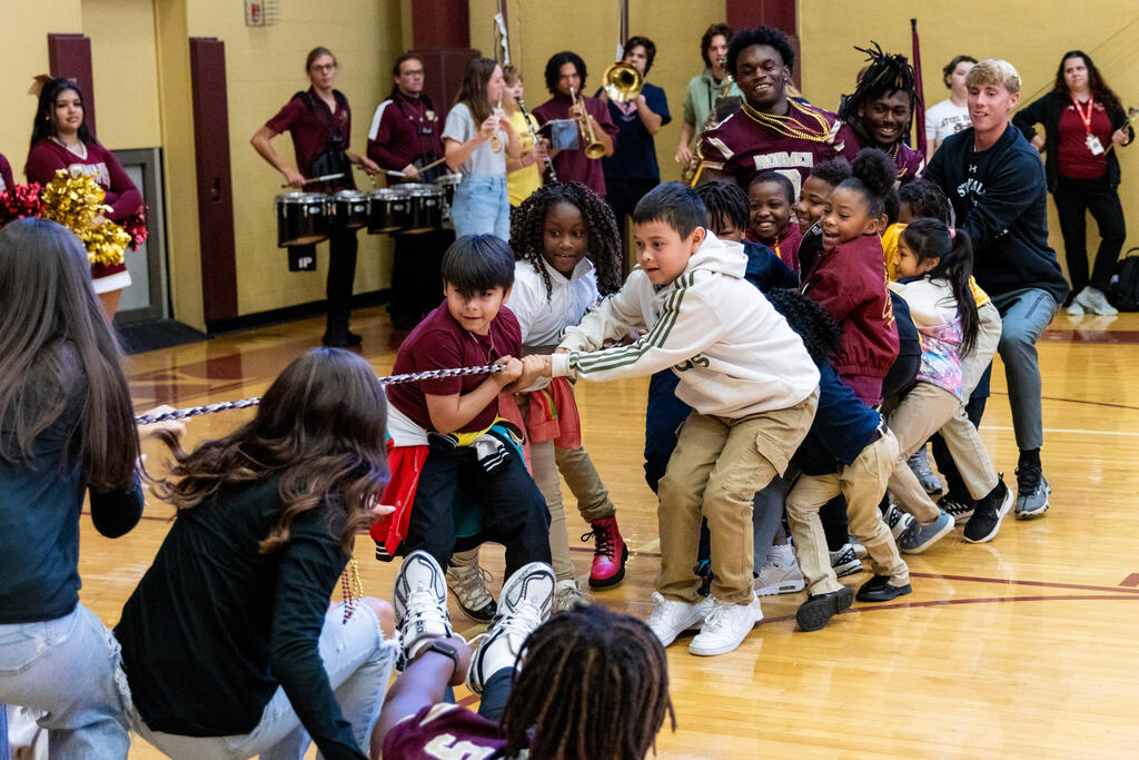 The cheerleaders and marching band led everyone in a couple of cheers and Steel Valley fight songs. Barrett students teamed up with high school students for a bunch of activities, including an intense push-up contest and a battle of tug-of-war that left some of the high school students flat on their backs!