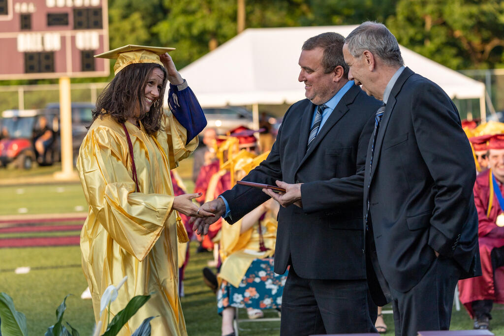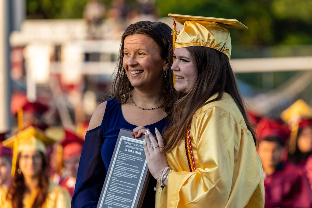 Since Dr. Vettel graduated early from Steel Valley, she did not attend commencement with the rest of the Class of 1998. As a surprise for her return to her alma mater, she was presented with a cap, gown and diploma on the 25th anniversary of her class' graduation.