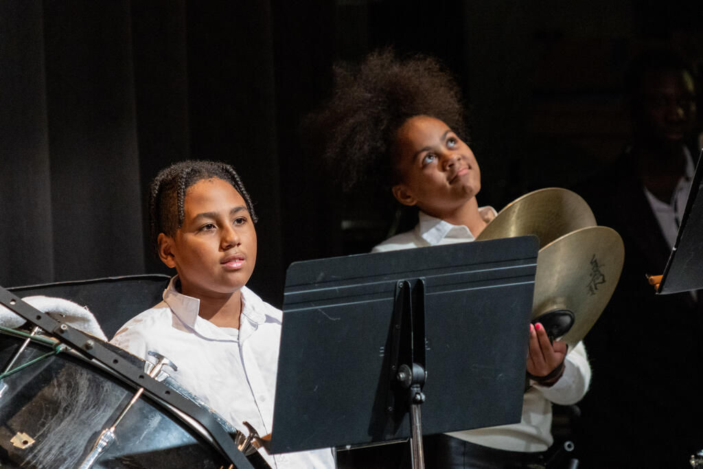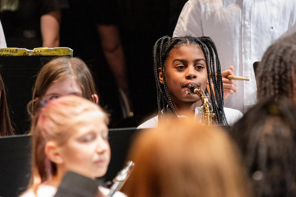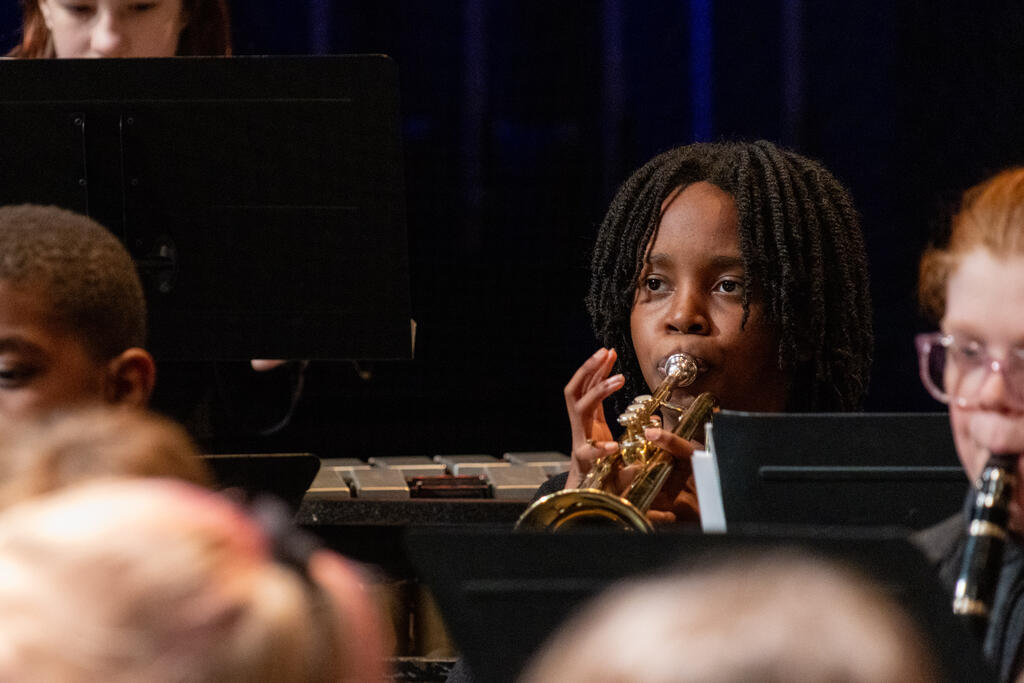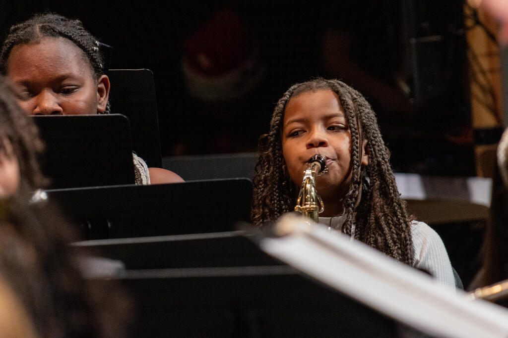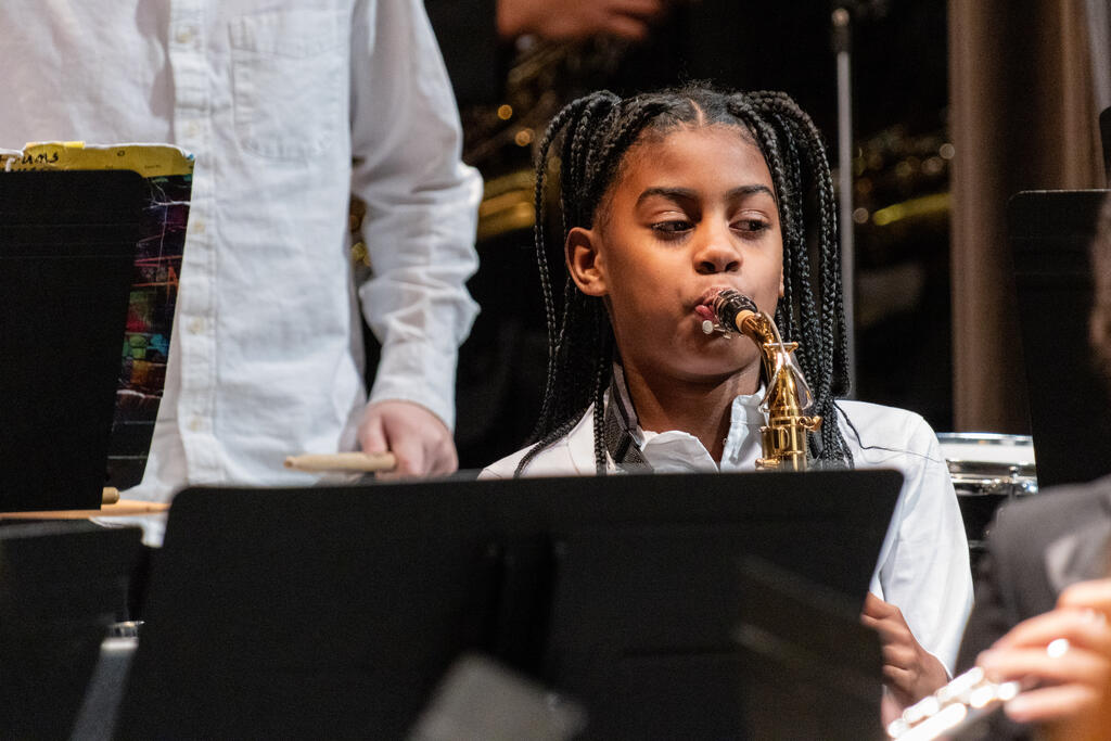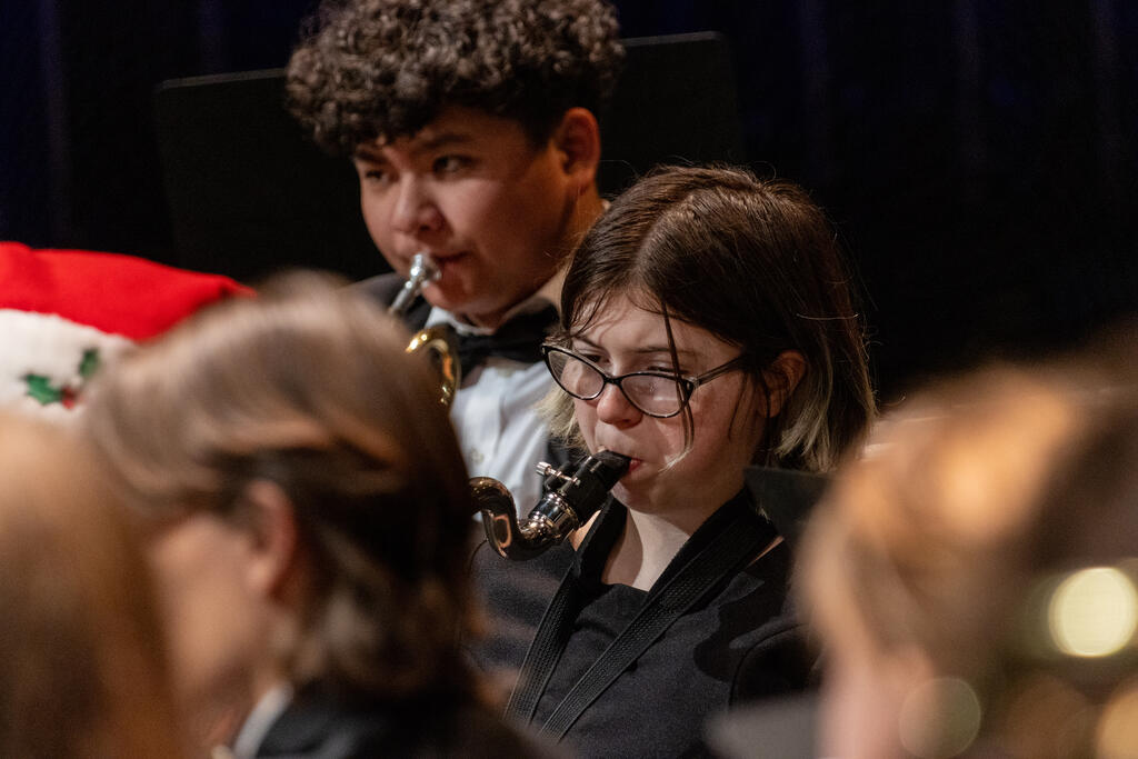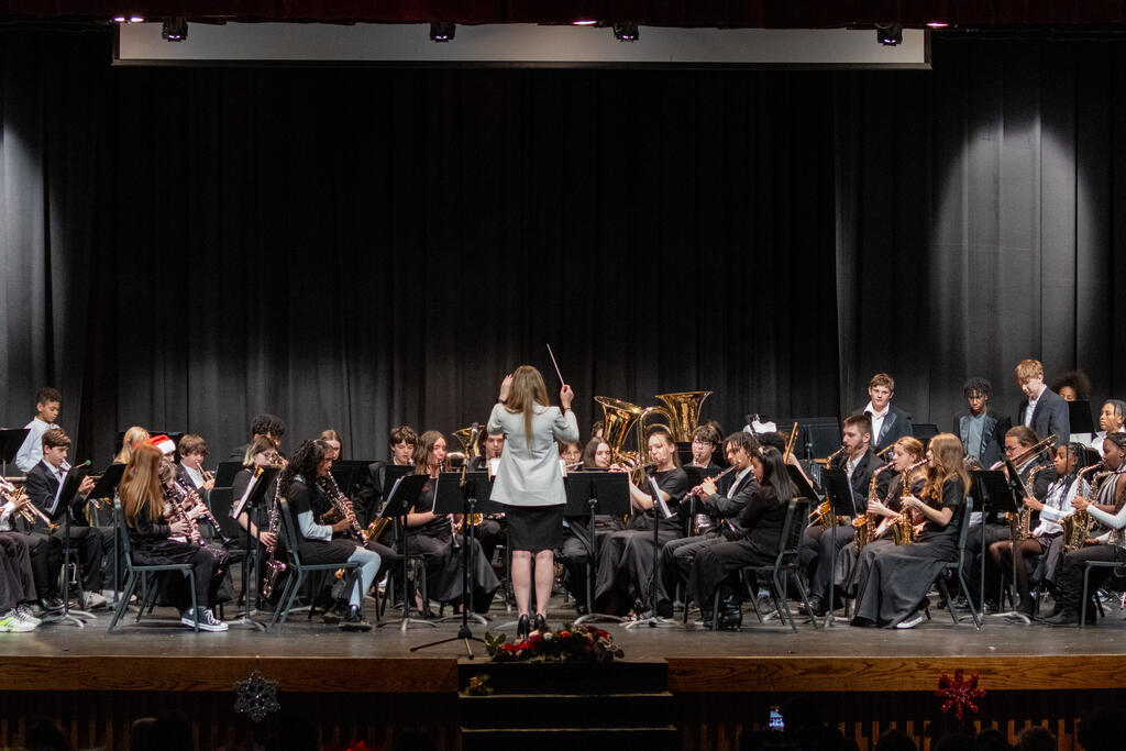 After a brief intermission, Ms. Malia Mueller and the fifth and sixth grade band took the stage. The students performed three songs familiar to fans of holiday music - "Jingle Bells," "Jolly Old Saint Nicholas," and "Bell Carol," which is a variation of "Carol of the Bells." The sixth graders stayed on stage for an additional solo performance of "Inception," and then were joined by the high school band for "Santa the Barbarian."