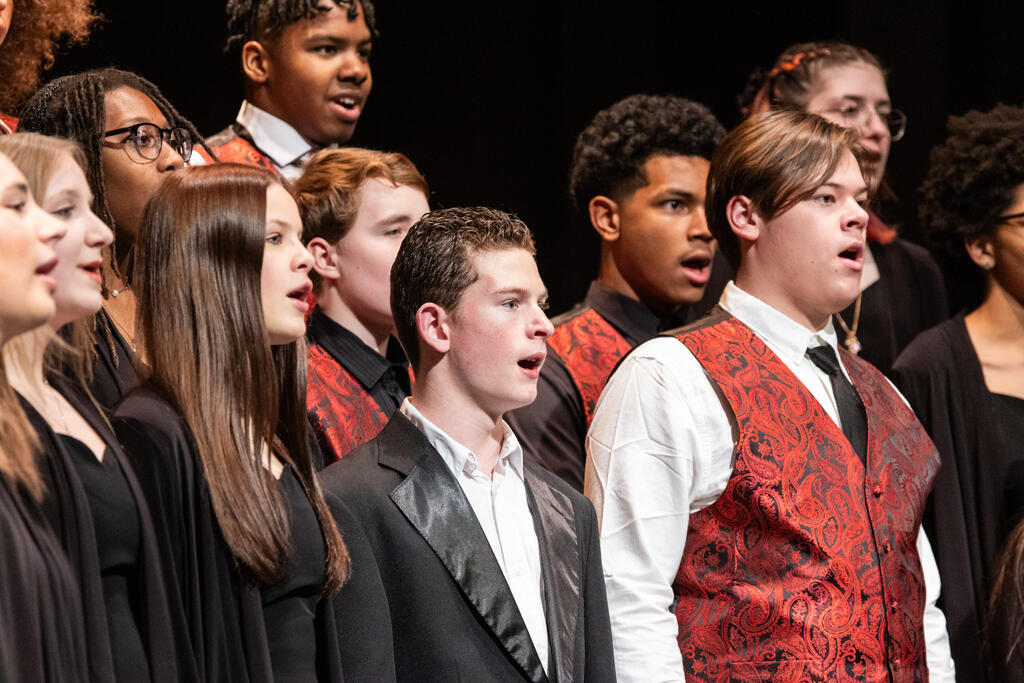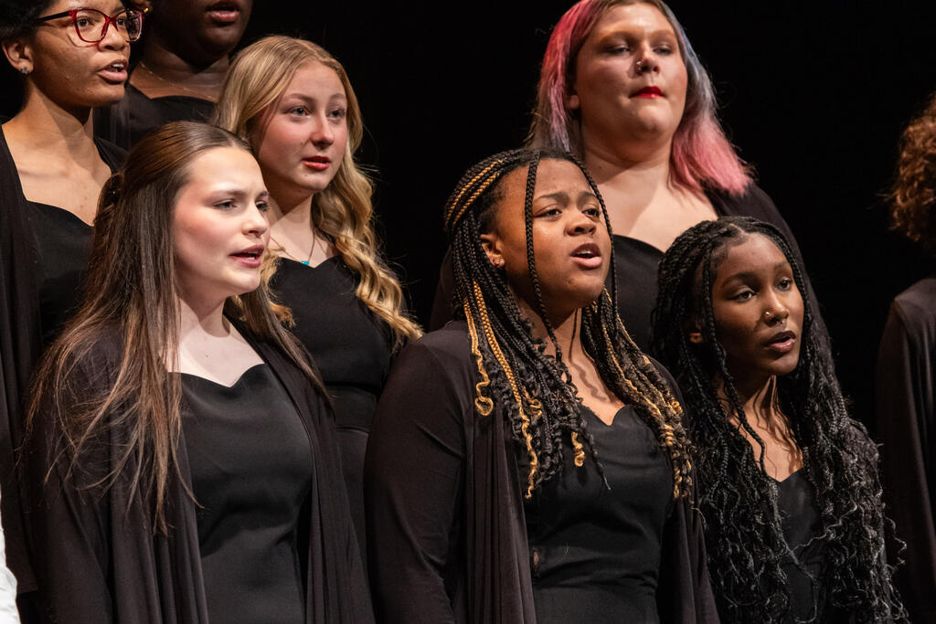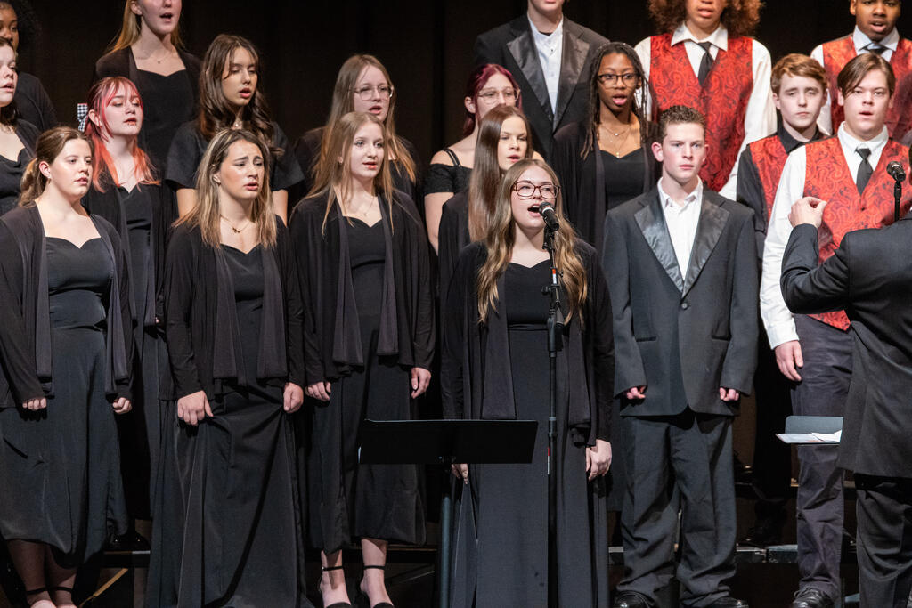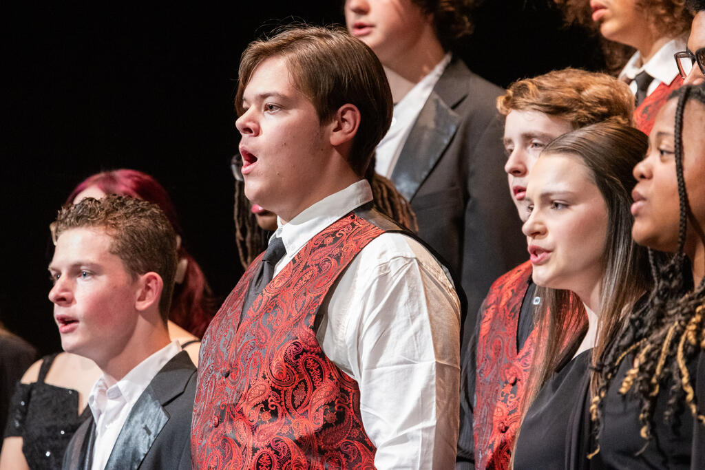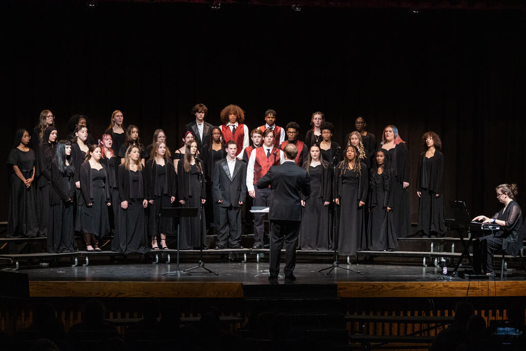 The High School Concert Choir opened the show under the direction of Mr. Andrew Roberts and accompanied by Mrs. Julie Mack on piano. The first two pieces were a pair of powerful, inspirational songs - "Ain't Gonna Let Nobody Turn Me Around," arranged by Rollo Dilworth, and "City Called Heaven" by Josephine Poelinitz. Next came the ode to friendship, "Count On Me," arranged by Andy Beck.