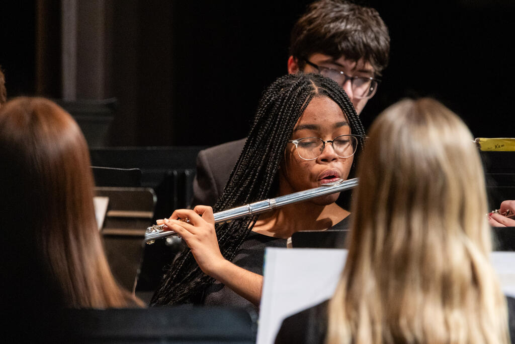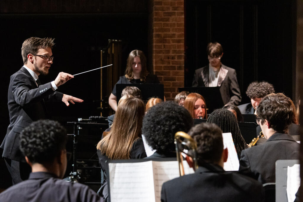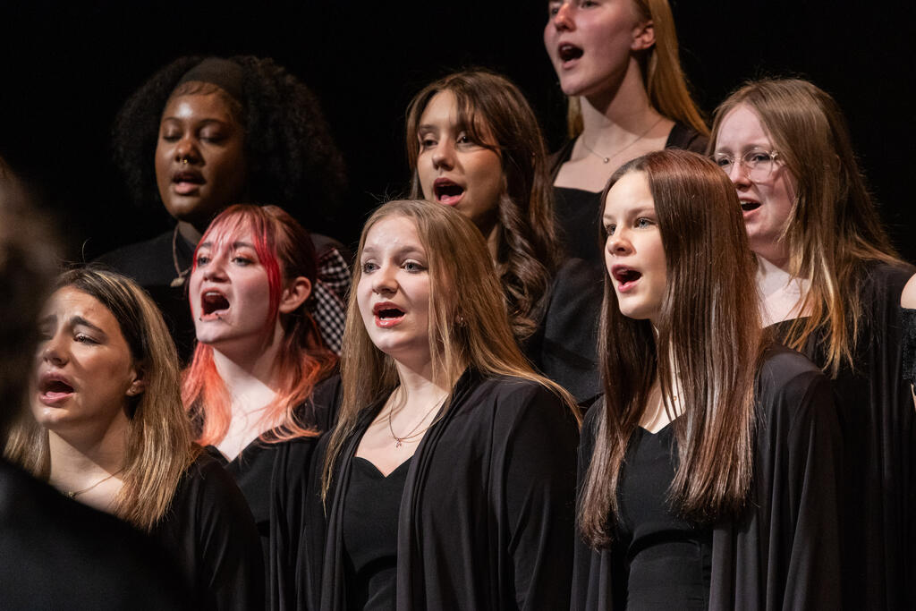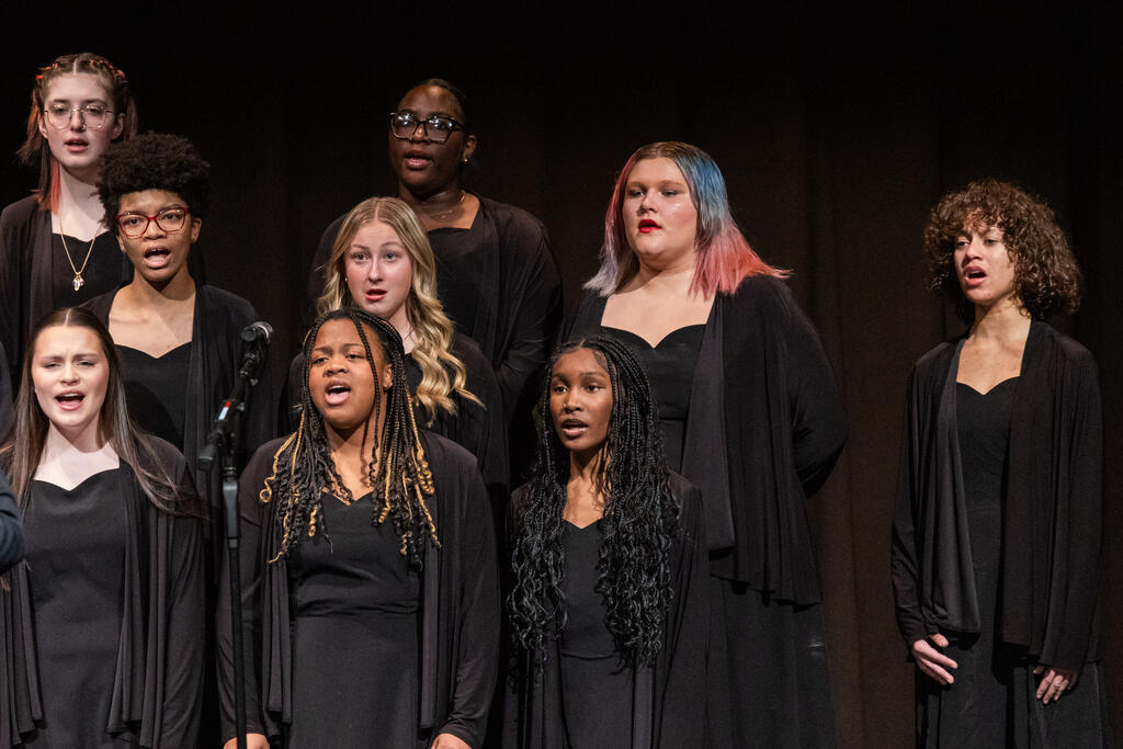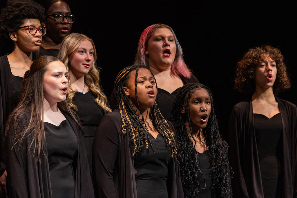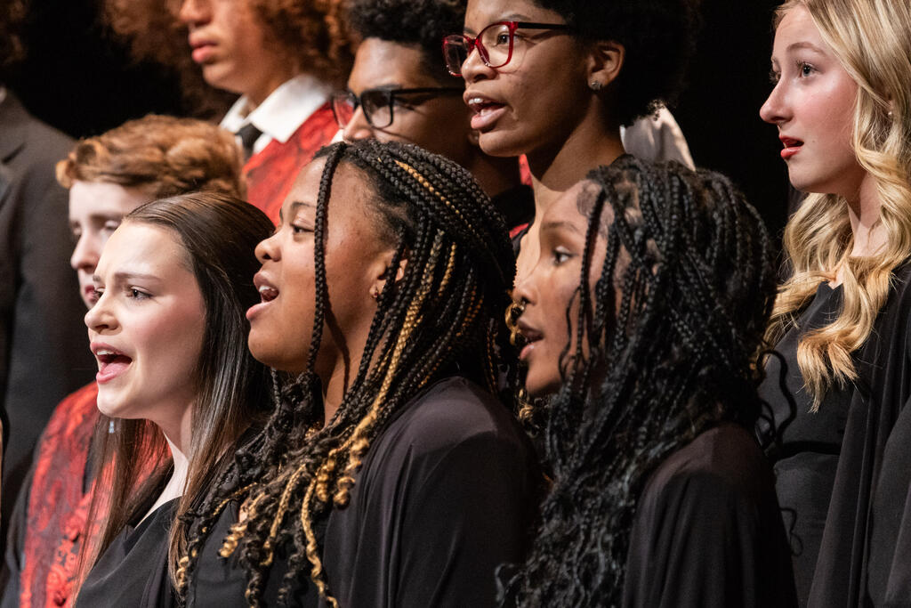 The High School Concert Choir opened the show under the direction of Mr. Andrew Roberts and accompanied by Mrs. Julie Mack on piano. The first two pieces were a pair of powerful, inspirational songs - "Ain't Gonna Let Nobody Turn Me Around," arranged by Rollo Dilworth, and "City Called Heaven" by Josephine Poelinitz. Next came the ode to friendship, "Count On Me," arranged by Andy Beck.