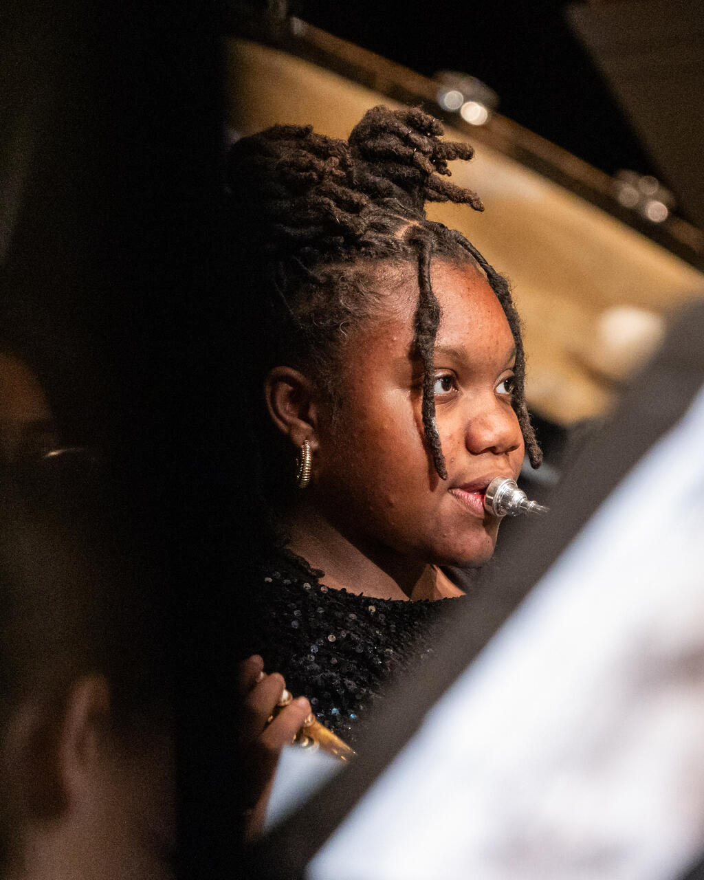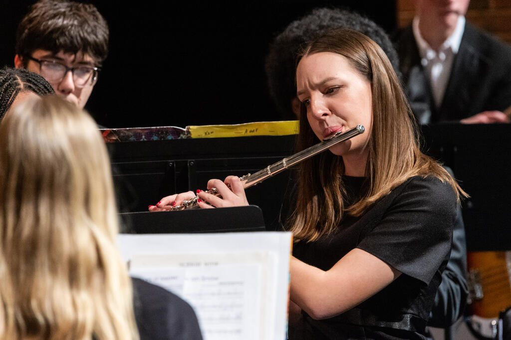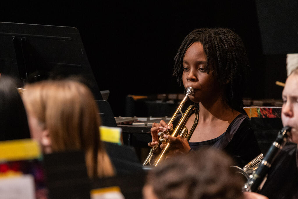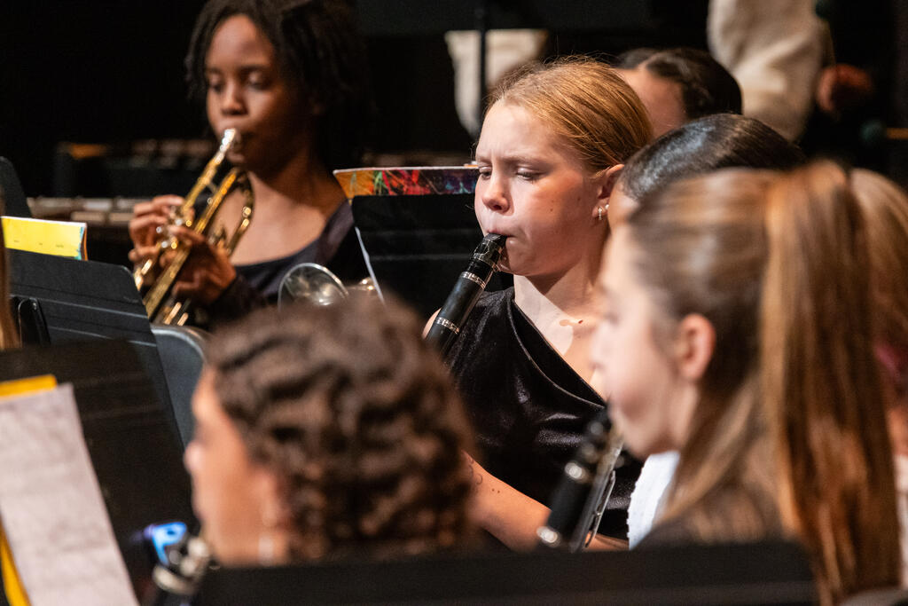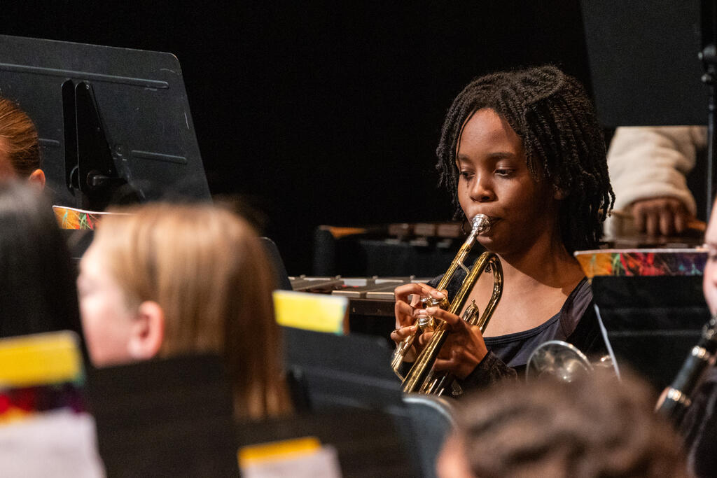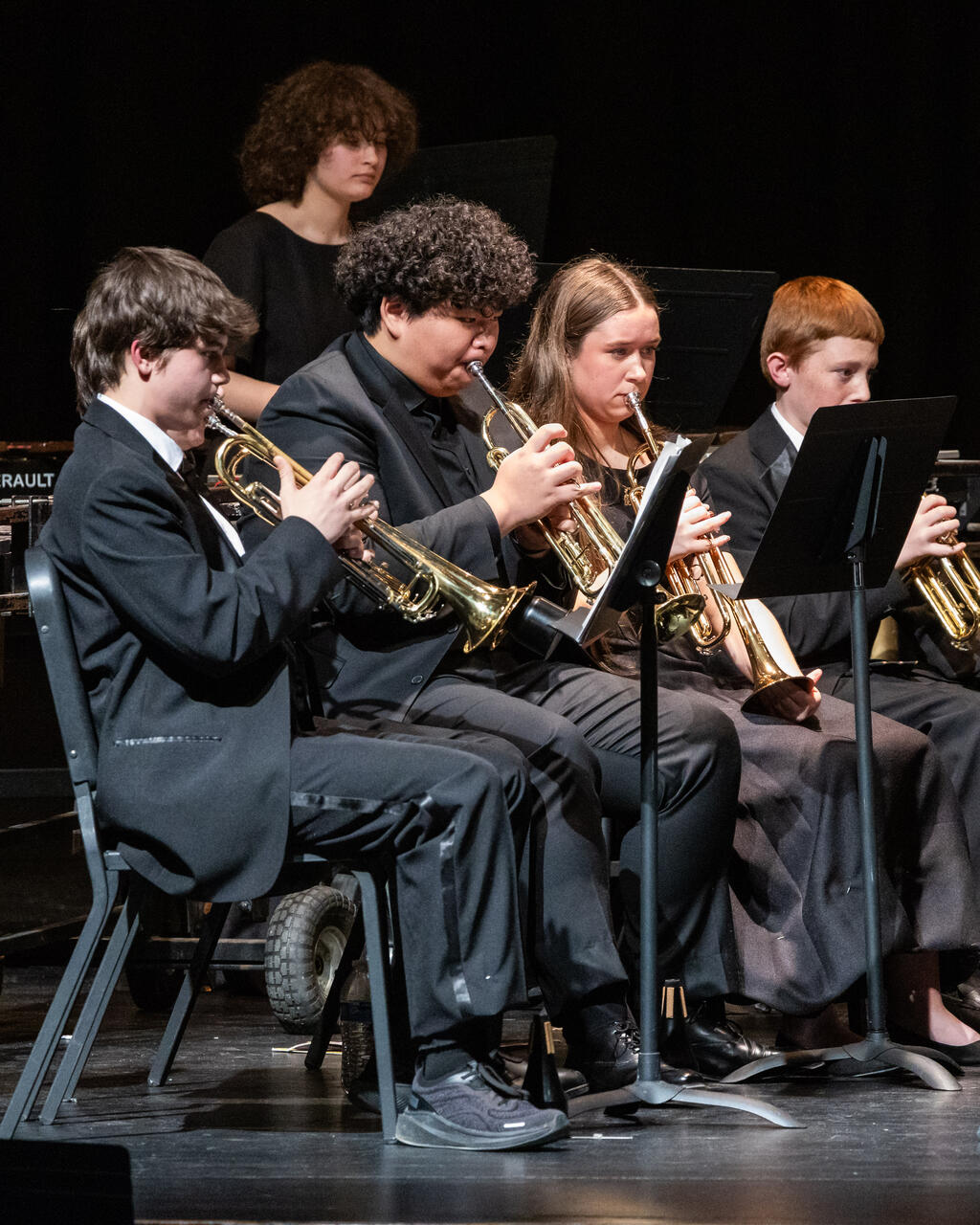 The seventh graders came on stage to create a full 7th-12th grade band for the final two numbers of the evening - "Variant on an Old English Carol" and the always exciting "Sleigh Ride."