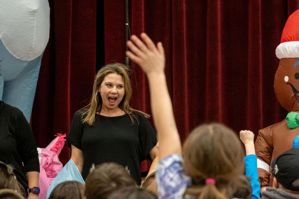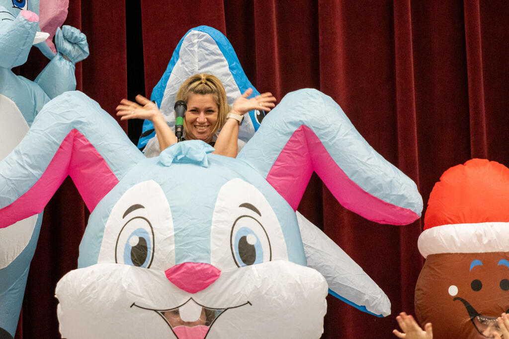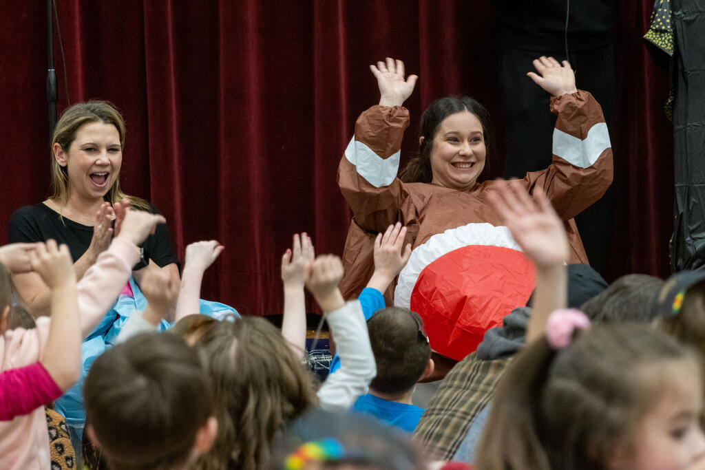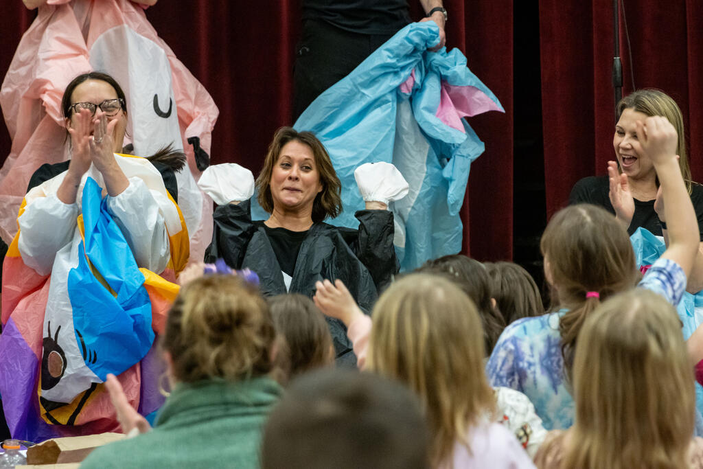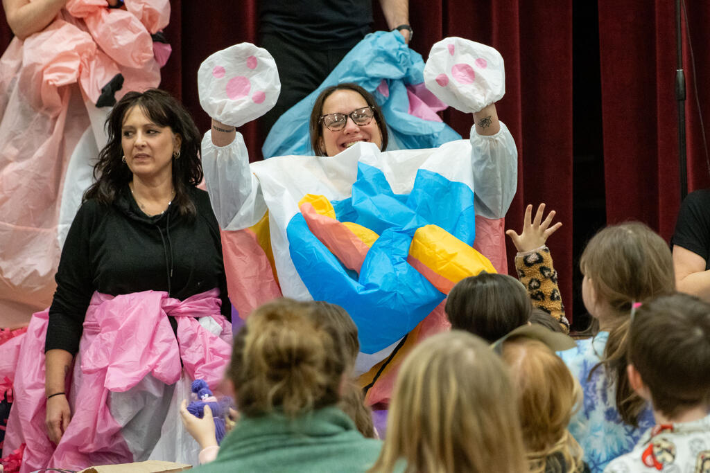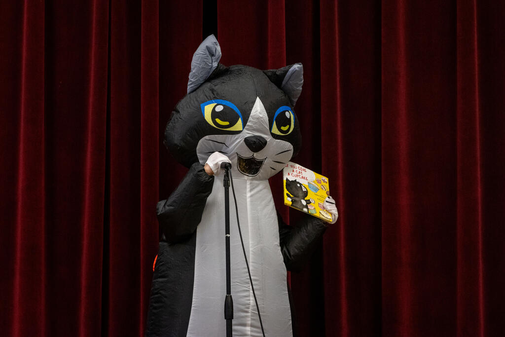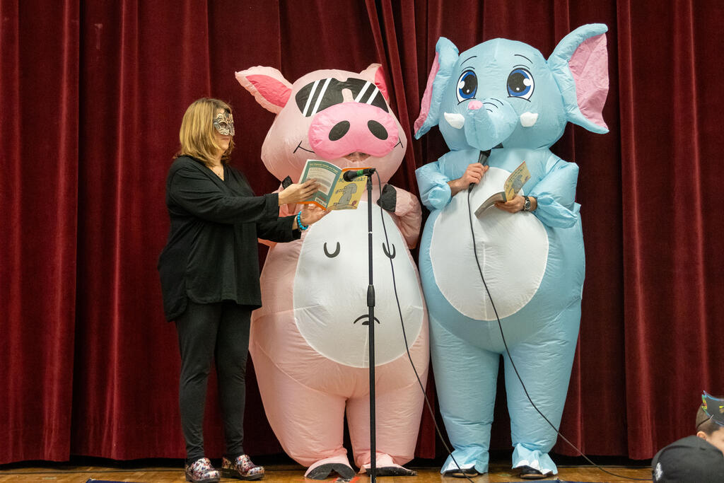 Each of the special guests had appeared in front of the students and families to either read or share details about one of their favorite books. The guests were hidden away inside puffy, inflatable costumes, and the only clues the students and families had to make their guesses were the voices of the readers along with some clues shared by Ms. Strom.