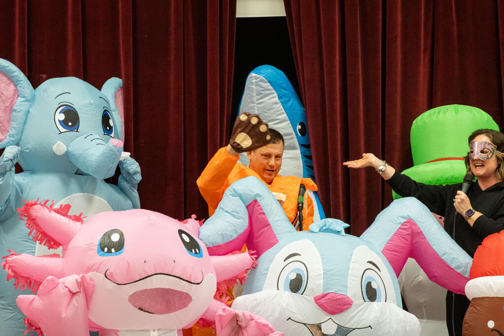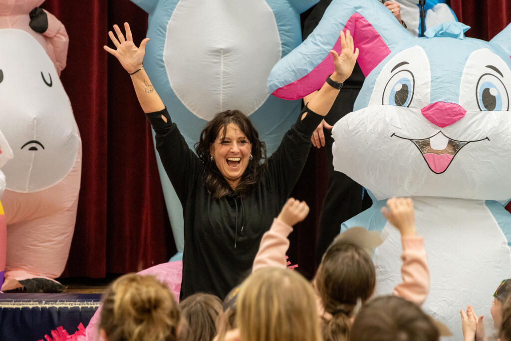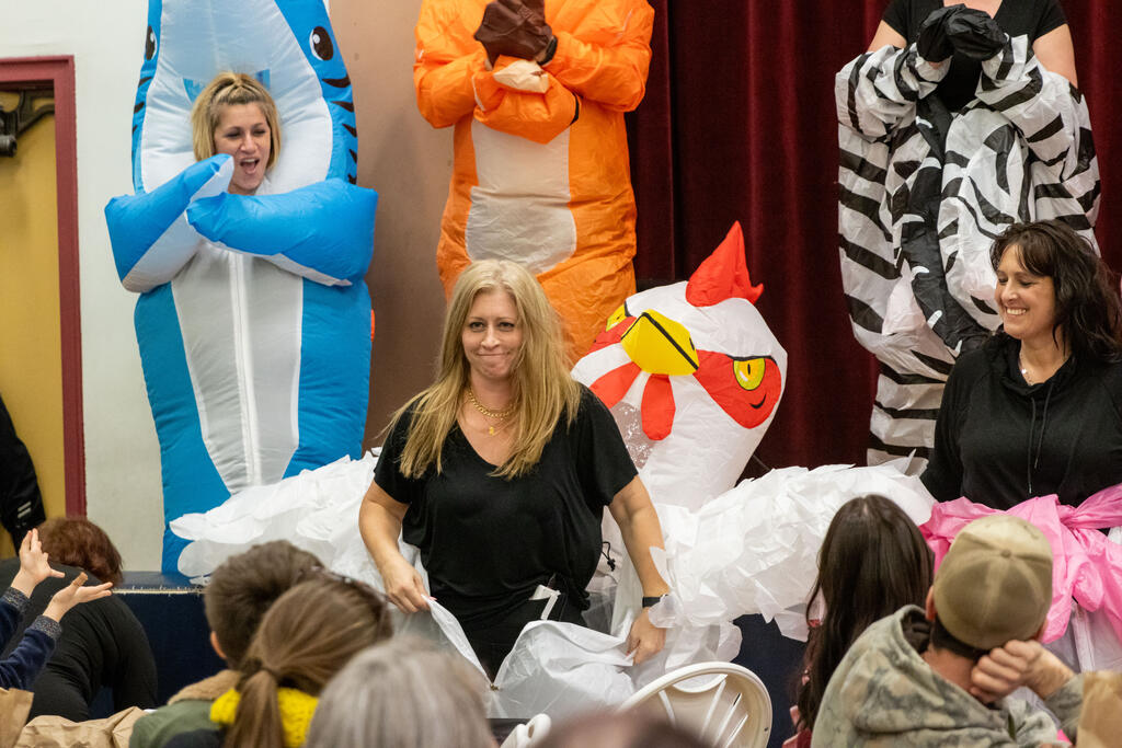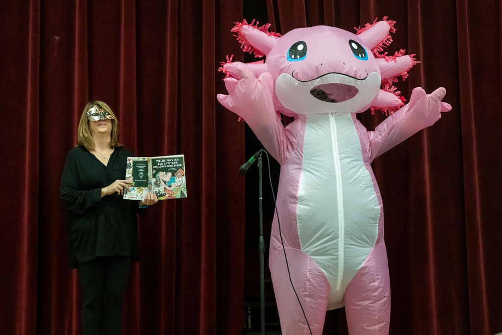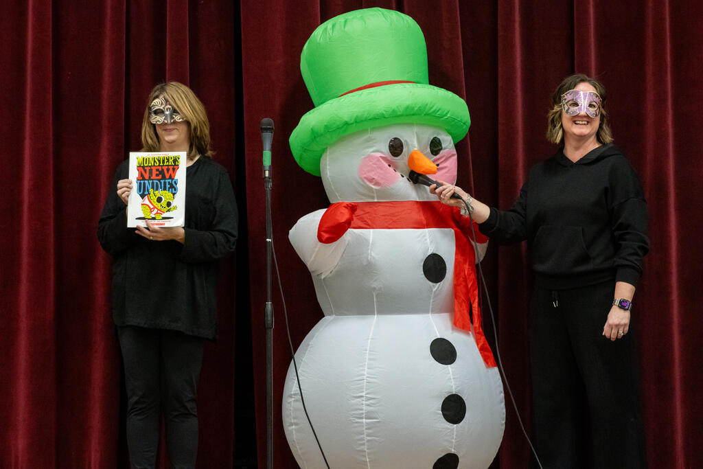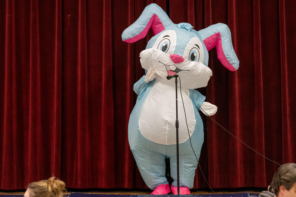Each of the special guests had appeared in front of the students and families to either read or share details about one of their favorite books. The guests were hidden away inside puffy, inflatable costumes, and the only clues the students and families had to make their guesses were the voices of the readers along with some clues shared by Ms. Strom.